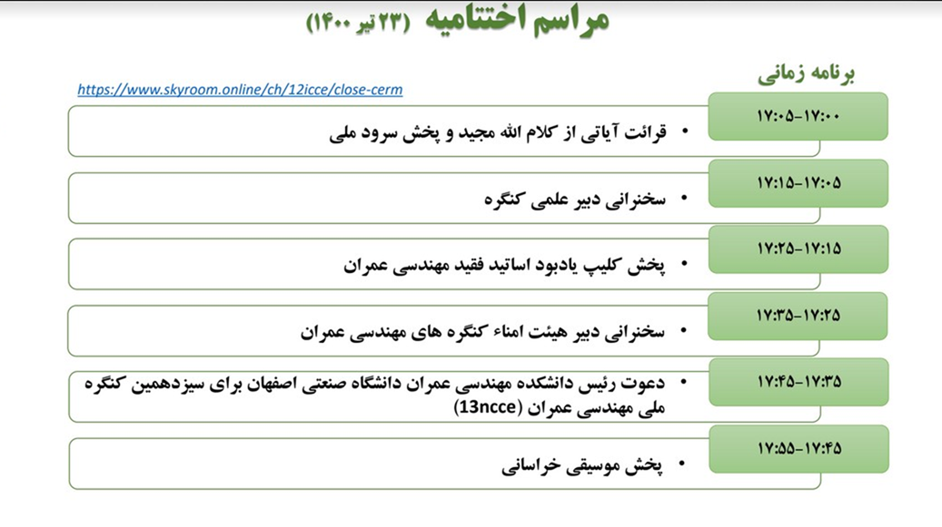 | Session Code | GE111 | Session Link | https://skyroom.online/ch/12icce/ge111 | |||||||||
